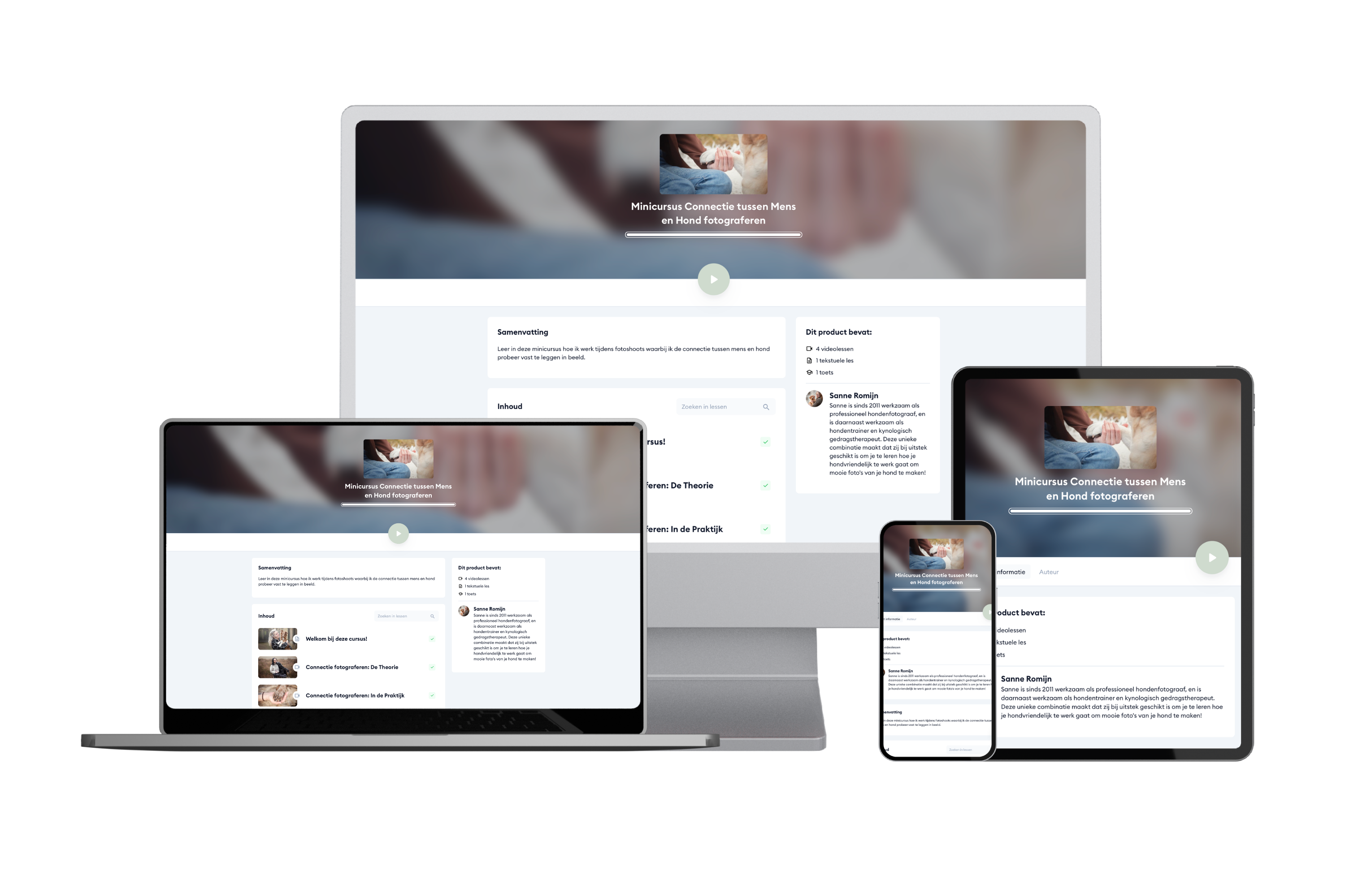 Je krijgt één theorievideo over technieken (locatiekeuze, poseren, lenskeuze en details), praktijkvideo's van vier echte fotoshoots en twee nabewerkingsvideo's in Lightroom en Photoshop.
